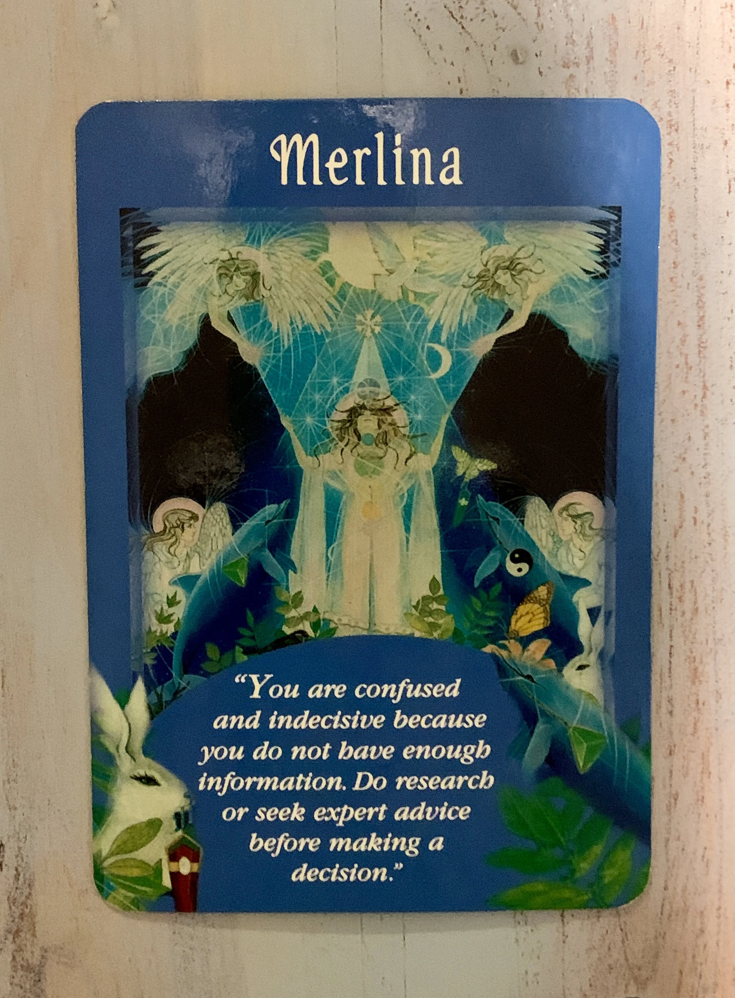 I wanted to share this card because it flew out while I was shuffling, and I greatly feel the message is important. Merlina represents the world and all living creatures. We (everyone in the universe) are indecisive and completely confused because some of the information we are reading is not accurate or false. This card (and referring to card #1) is going back to PATIENCE. Keep researching what is really going on, and seek credible expert advice. If you are questioning a move, a trip, or simply “what to do now”, PAUSE and use your meditation + mindfulness techniques before making any rash decisions.